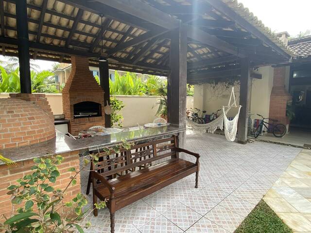 A área externa com ampla mesa, piscina, churrasqueira e forno a lena e ainda uma mesa de ping e pong
